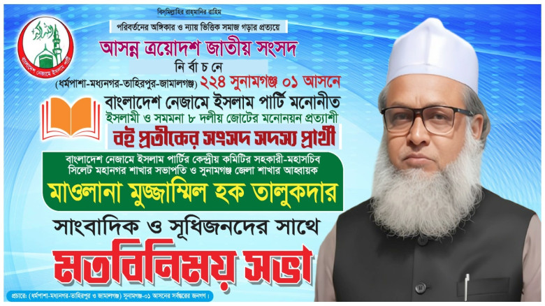মাওলানা মুজ্জাম্মিল হক তালুকদার বর্তমানে বাংলাদেশ নেজামে ইসলাম পার্টির কেন্দ্রীয় কমিটির সহকারী মহাসচিব, সিলেট মহানগর শাখার সভাপতি ও সুনামগঞ্জ জেলা শাখার আহ্বায়ক হিসেবে দায়িত্ব পালন করছেন। সভায় তিনি বলেন, দীর্ঘদিন জনগণের পাশে থেকে সামাজিক, ধর্মীয় ও মানবিক কাজ করে আসছেন এবং নির্বাচিত হলে দুর্নীতিমুক্ত ও ন্যায়ভিত্তিক সমাজ প্রতিষ্ঠায় কাজ করবেন।