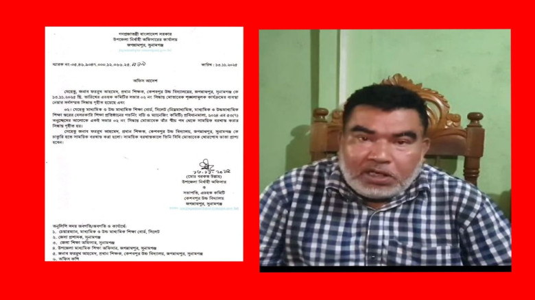 সুনামগঞ্জের জগন্নাথপুরে সপ্তম শ্রেণির এক ছাত্রীকে নির্যাতনের সিসিটিভি ফুটেজ সামাজিক যোগাযোগমাধ্যমে ভাইরাল ও গণমাধ্যমে সংবাদ প্রকাশের পর কেশবপুর উচ্চ বিদ্যালয়ের প্রধান শিক্ষক ফররুখ আহমেদকে সাময়িকভাবে বরখাস্ত করেছে উপজেলা নির্বাহী কর্মকর্তা ও বিদ্যালয় ব্যবস্থাপনা কমিটি।