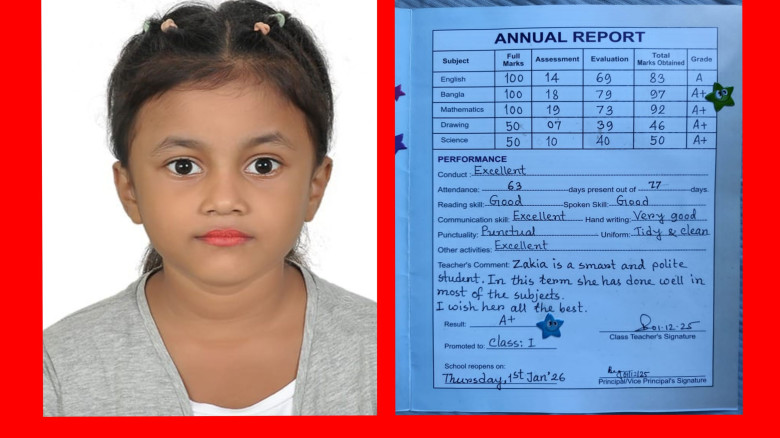 “জাকিয়া স্মার্ট, ভদ্র ও মনোযোগী ছাত্রী। এই টার্মে সে অসাধারণ করেছে। ভবিষ্যতের জন্য শুভকামনা।”