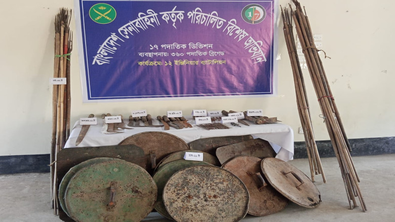একটি তলোয়ার, চারটি দেশীয় রামদা, তিনটি দেশীয় কুড়াল, চারটি দেশীয় দা-বটি, পাঁচটি বড় ছুরি, চারটি ছোট চাকু, সতেরটি টেডা, পাঁচটি ফলা, এগারটি ঢাল, পঁয়ত্রিশটি বর্ষা, একটি চায়না চাকু এবং একটি বল্লম।